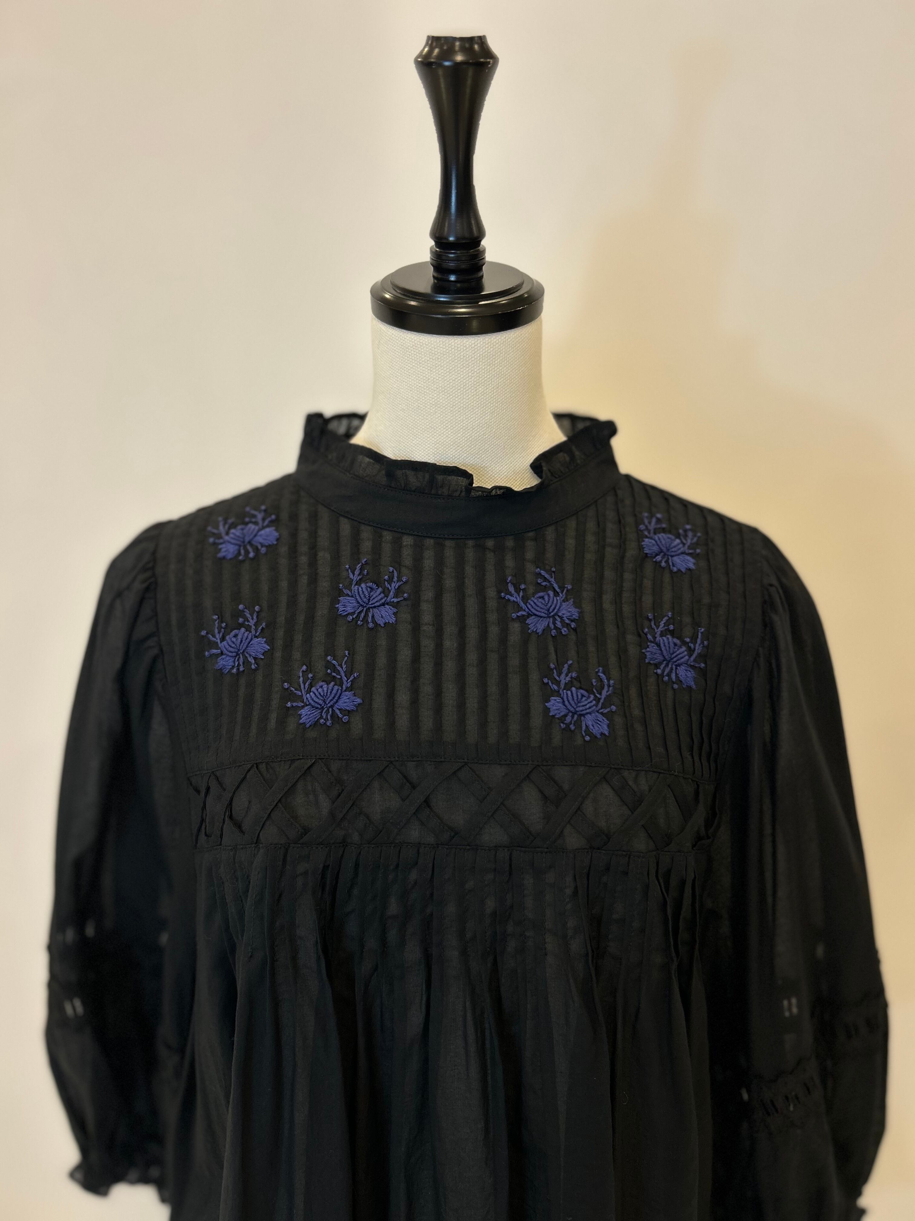 ピンタックと贅沢なハンド刺繍がポイントのブラウス。刺繍のモチーフとしてバラと蕾を施しました。襟元と袖先はギャザーを寄せてロマンティックに。